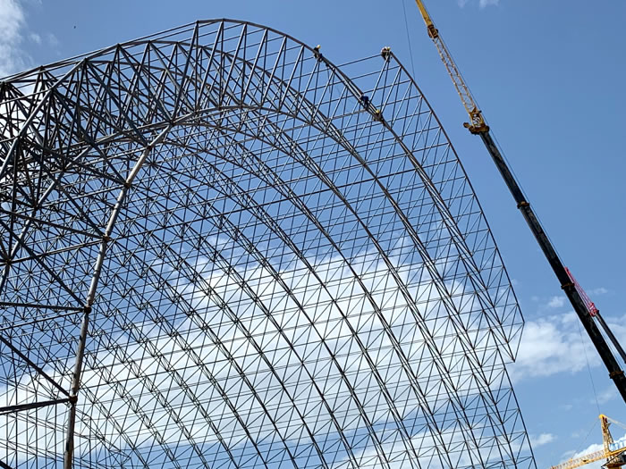(2)网架加工前应对现场尺寸进行复测,确认无误后方可进行加工、安装;网架制作、运输、安装应遵守《空间网格结构技术规程》JGJ7-2010、《钢网架义马螺栓球节点》JG/T 10-2009、《钢网架义马螺栓球节点用高强度螺栓》 GB/T 16939-2016、《义马钢结构义马工程义马施工规范》 GB50755-2012、《义马钢结构义马工程义马施工质量验收标准》 GB50205-2020。